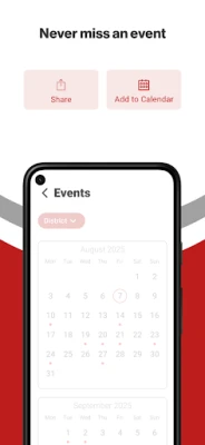 NEVER MISS AN EVENT The event section shows a list of events throughout the district. Users can add an event to their calendar and share the event with friends and family with one tap.