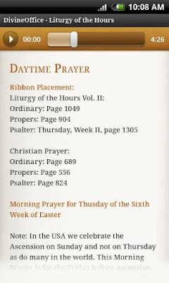 This version is the official prayer book of the Catholic Church, however, it is suitable for all Christian faith traditions. It contains the official text and audio of daily prayers from the Liturgy of the Hours of the Roman Catholic Church (Breviary) and has been approved for use in the United States by USCCB.